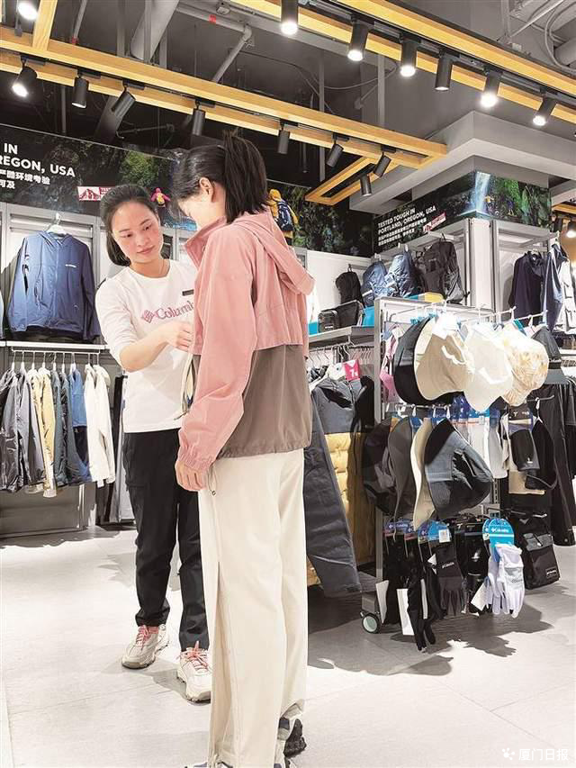 在大西洋天虹商场的服装售卖区,有两个售卖户外出行服装的品牌门店,分别是哥伦比亚(Columbia)和骆驼(CAMEL)。店内人来人往,不断有顾客试穿各式各样的户外服饰。其中一家门店的负责人高女士告诉记者,消费者比较偏好旅游、登山、露营等户外活动,包括徒步鞋、薄外套、薄夹克、速干衣裤在内的户外服饰最近都卖得很好。